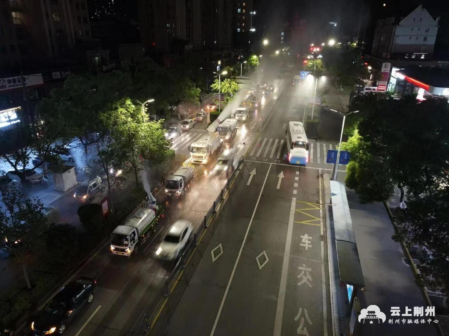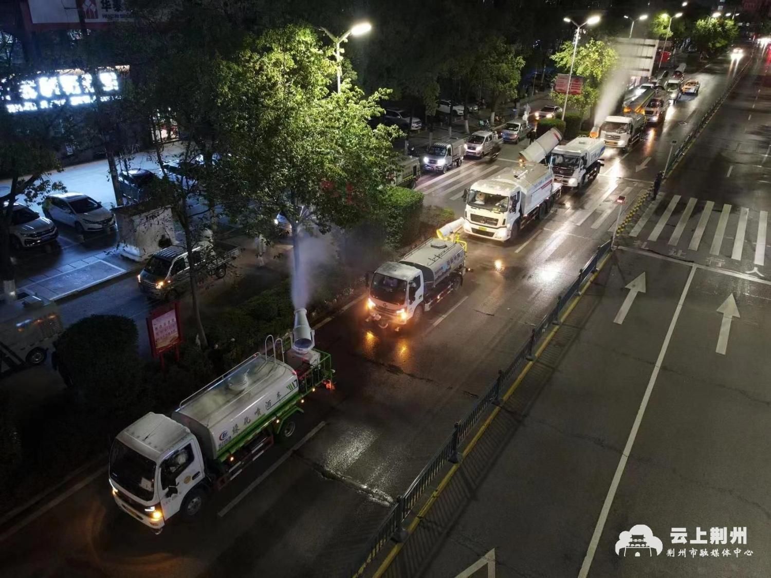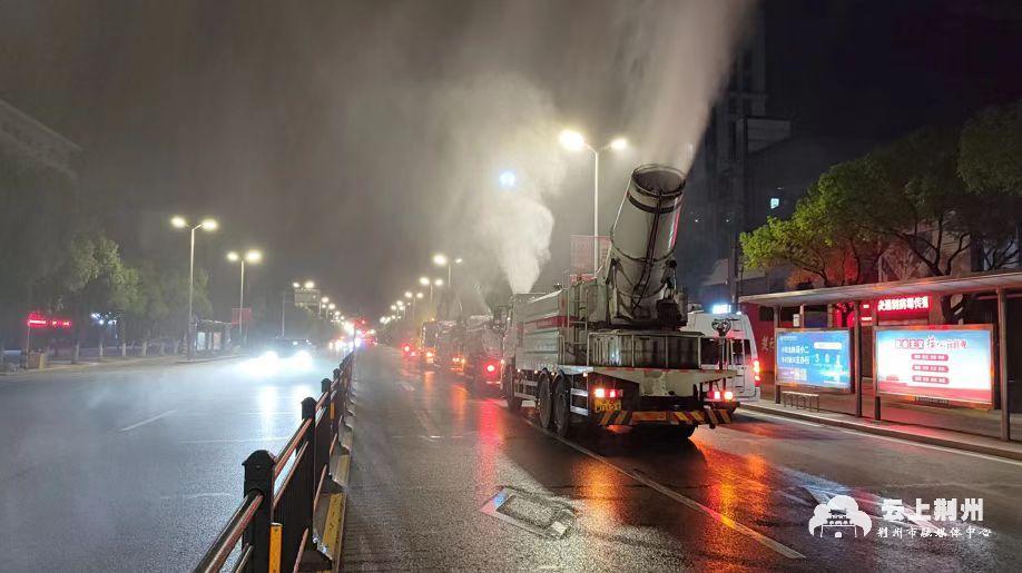 为精准应对当前严峻的疫情防控形势,进一步净化城区卫生环境,10月9日晚19时起,在江津路与武德路交界处,沙市区城管执法局组织大型雾炮车、高压冲洗车等各种车辆,结合人工喷洒,沿既定路线对城区主次干道、重点区域开展“全覆盖、无死角、无盲区、无空白”全域消杀作业。