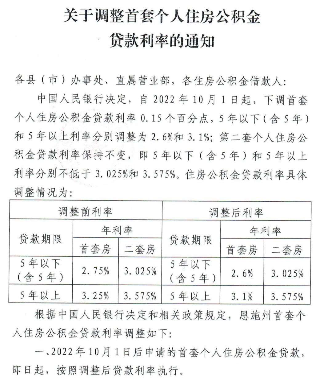 根据《中国人民银行决定下调首套个人住房公积金贷款利率》,自2022年10月1日起,调整个人住房公积金贷款利率,现将有关事宜通知如下: