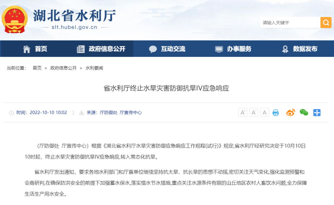 10月2日至8日,全省自西北向东南普降小到中雨,局部大到暴雨,长江委调度三峡水库、丹江口水库加大下泄流量,长江、汉江干流水位明显上涨,农村应急送水人口降至旱情发生以来最低,农业用水大幅减少,全省水利工程供水能力能够满足秋冬播等农业灌溉用水。下一阶段,各地水利部门和厅直单位继续坚持抗大旱、抗长旱的思想不动摇,密切关注天气变化,强化监测预警和会商研判,在确保防洪安全的前提下加强蓄水保水,落实惜水节水措施,重点关注水源条件有限的山丘地区农村人畜饮水问题,全力保障生活生产用水安全。