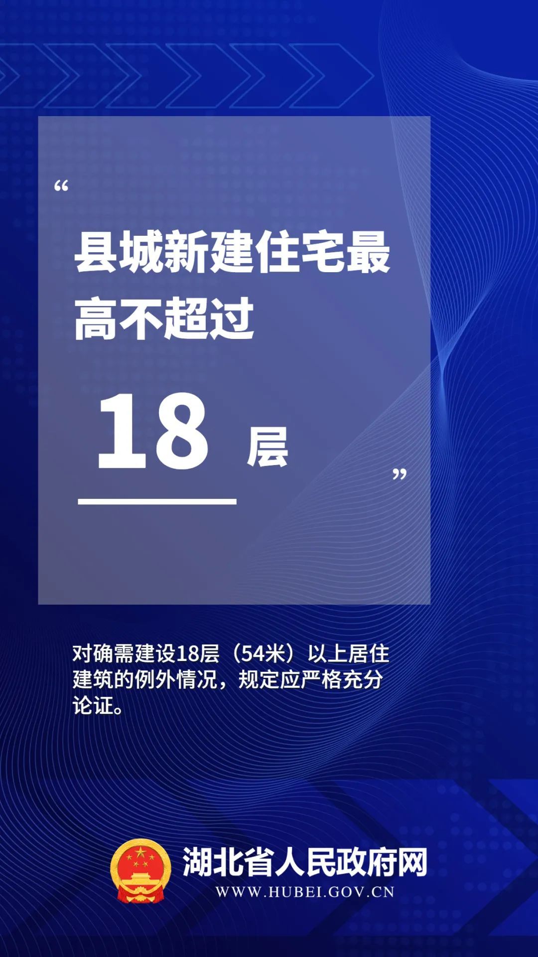按照县城民用建筑高度要与消防救援能力相匹配的原则,对县城建筑的高度作出严格规定:县城新建住宅以6层为主,6层及以下住宅建筑面积占比应不低于70%。鼓励新建多层住宅安装电梯。县城新建住宅最高不超过18层(54米)。对确需建设18层(54米)以上居住建筑的例外情况,规定应严格充分论证。