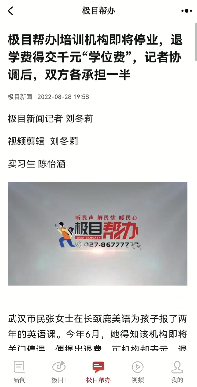 此外,“极目帮办”高度重视视频化呈现:一是为该栏目量身定制“极目帮办”专属视频片头,以区别于极目新闻其他稿件的常规片头;二是要求所有栏目稿件,在编发时必须配上新闻视频。