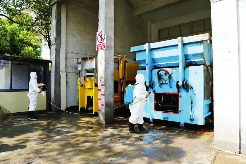 环卫工人正在垃圾中转站消杀灭菌。 (随州日报全媒记者李文军、通讯员聂少峰摄)
