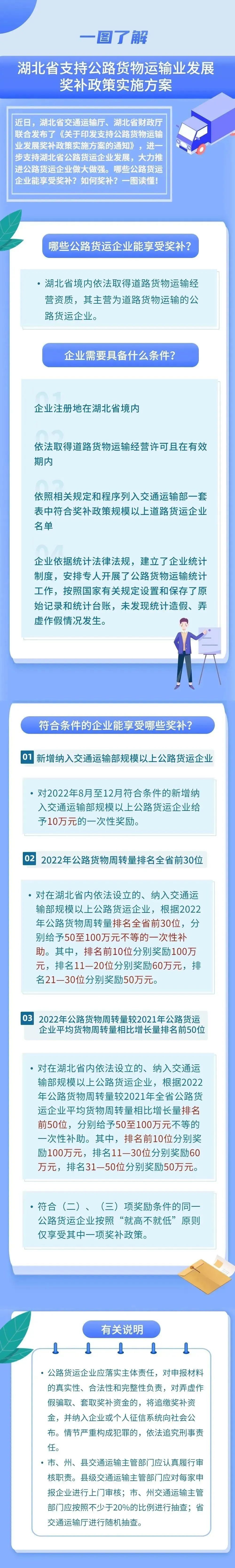 对在湖北省内依法设立的、纳入交通运输部规模以上公路货运企业,根据2022年公路货物周转量排名全省前30位,分别给予50至100万元不等的一次性补助。其中,排名前10位分别奖励100万元,排名11-20位分别奖励60万元,排名21一30位分别奖励50万元;