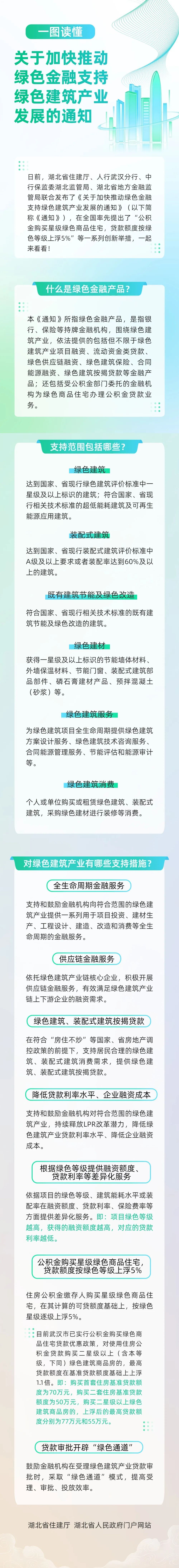 日前,湖北省住建厅、人行武汉分行、中行保监委湖北监管局、湖北省地方金融监管局联合发布了《关于加快推动绿色金融支持绿色建筑产业发展的通知》(以下简称《通知》),助力我省建筑产业绿色低碳转型发展,创新提出了“公积金购买星级绿色商品住宅,贷款额度按绿色等级上浮5%”、“根据绿色等级提供融资额度、贷款利率等差异化服务”等一系列举措,一图来了解!