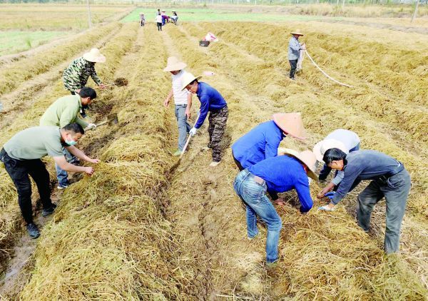 10月21日,沙洋县毛李镇毛李村农民在田间利用水稻秸秆作基料种植赤松茸。据了解,赤松茸不仅富含蛋白质和多种矿物质元素、维生素,还有很高的药用价值,是市场上的抢手货,经济效益可观。毛李镇组织各村利用冬闲田试验示范稻田露天轮作赤松茸,就地高效转化利用秸秆,带动群众增收致富。截至目前,该镇共种植赤松茸500亩。(记者 朱舜 通讯员 何磊 摄)