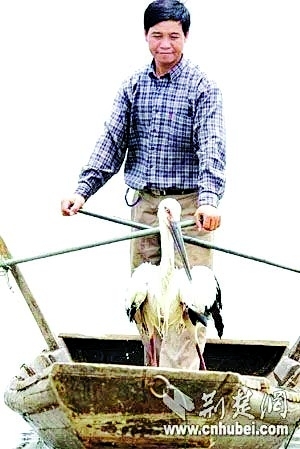 2005年,龙友福携东方白鹳驾船巡湖。(资料图片)