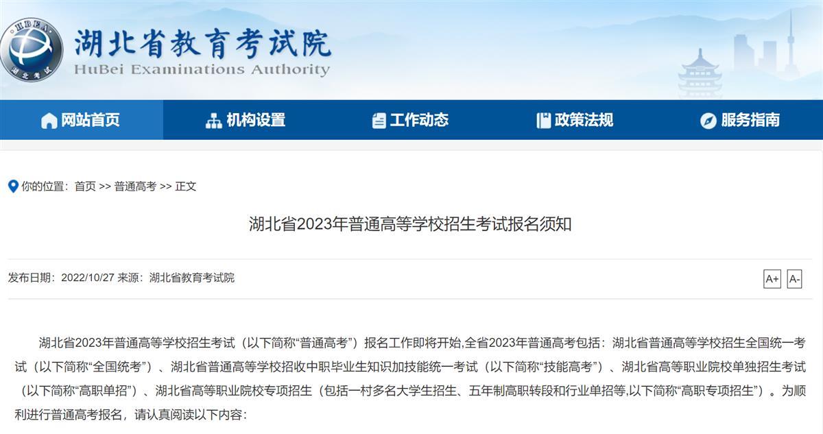 《湖北省2023年普通高等学校招生考试报名须知》全文详见http://www.hbea.edu.cn/html/2022-10/13112.html
