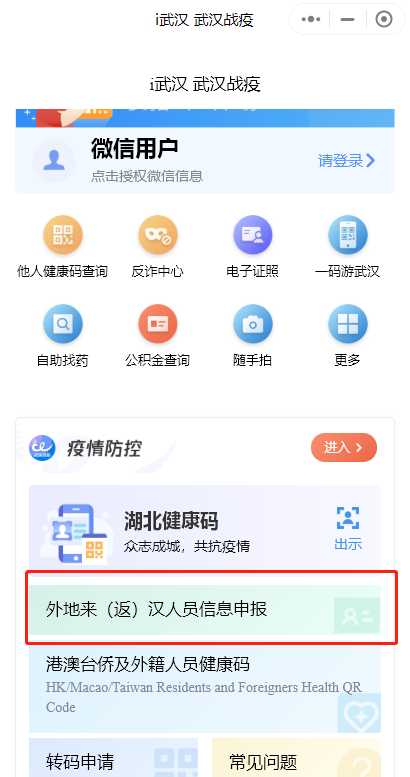 所有来(返)汉人员应在抵汉前7天内通过“i武汉 武汉战疫”微信小程序,点击“外地来(返)汉人员信息申报”,主动、如实填写来源地、目的地等相关信息进行报备,积极配合落实各项疫情防控措施。来(返)汉人员完成在线信息申报后,方可进行落地核酸采样;若来(返)汉人员未完成在线信息申报,不能乘坐公共交通工具、前往公共场所和办理酒店入住手续。