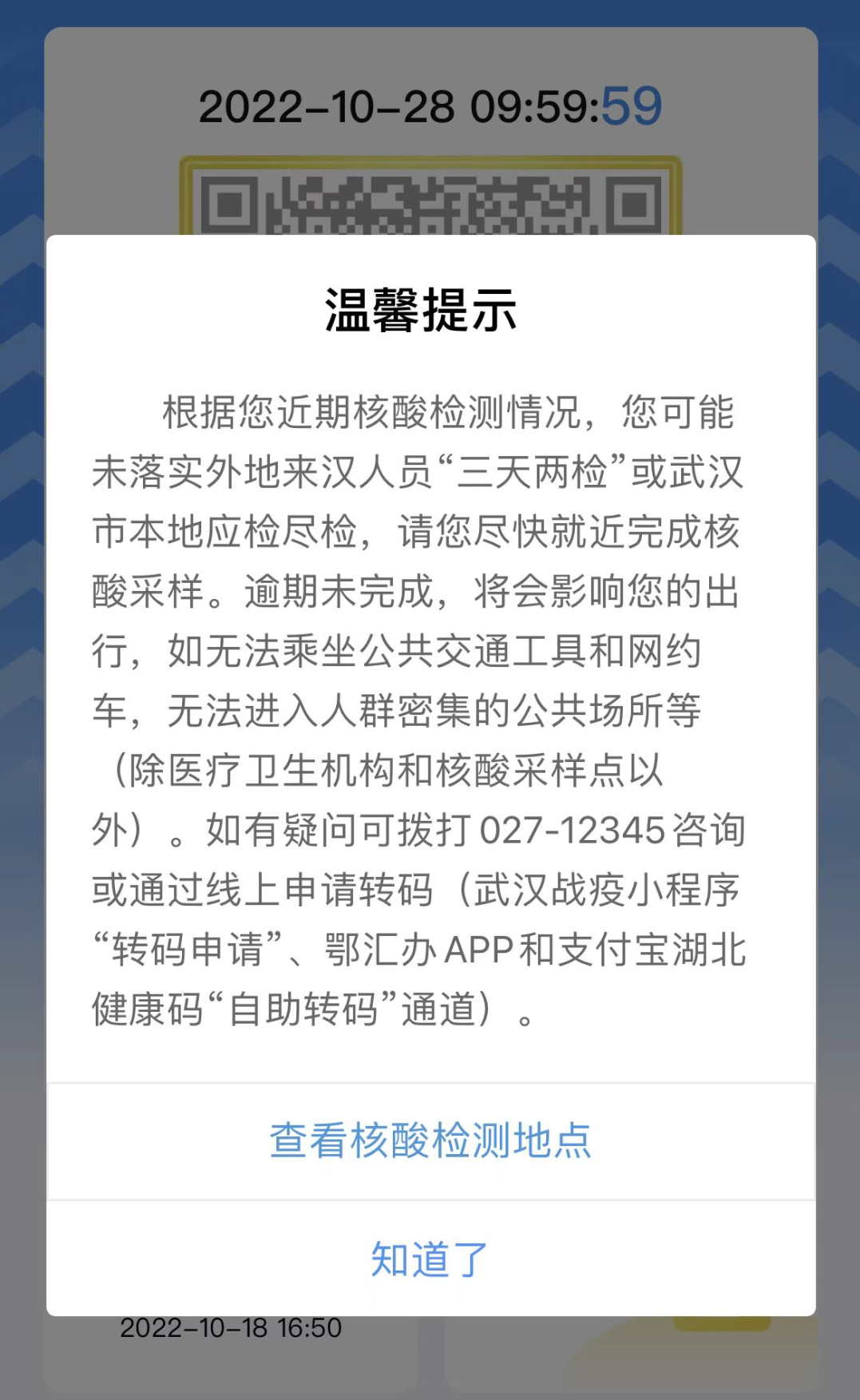 所有来(返)汉人员应在机场、火车站、进城高速出口现场进行落地核酸检测,做到“应检尽检”。在检测结果出来之前,务必做好个人防护,非必要不外出,不聚集不聚餐,出行全程佩戴口罩。如来(返)汉人员未及时申报或24小时内未完成核酸检测,健康码将会弹窗并赋灰码。