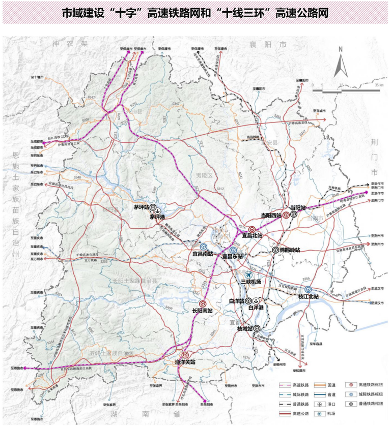 其中提到宜昌市域规划建设“十字”高速铁路网和“十线三环”高速公路网;构筑“四纵六横”快速路网,链接主城、新城,实现枢纽间快速转换;规划“2条城市轨道+5条市域铁路”支撑组团城市空间结构。