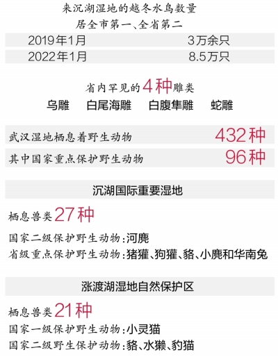 近几年,沉湖国际重要湿地核心区和缓冲区的湖面、鱼塘纷纷退出养殖,退养还湿面积多达7.8万亩,还对2.1万亩退化湿地进行了生态修复。与此同时,每年来沉湖湿地越冬水鸟数量也在同步增长。2019年1月只有3万余只,今年1月已增至8.5万只,居全市第一、全省第二。