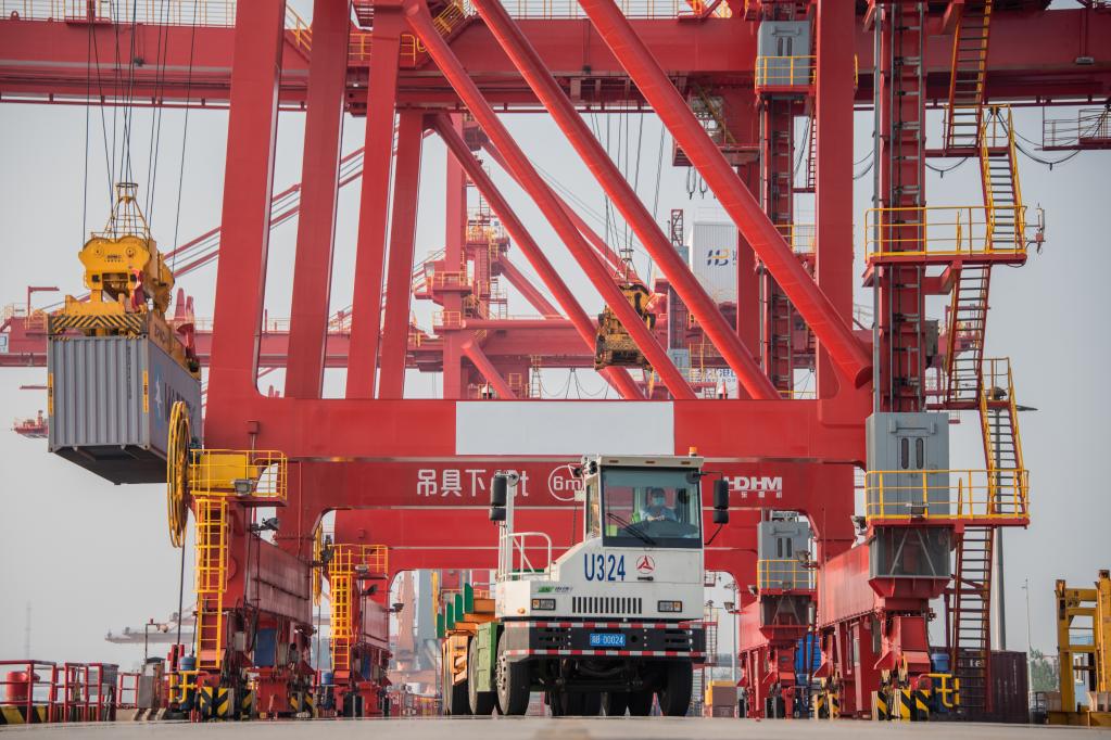 10月17日,货车在武汉阳逻港一期码头运送集装箱。新华社记者 伍志尊 摄