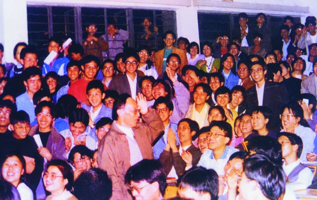 杨叔子在高校中倡导并率先开展文化素质教育,使华中理工大学(现华中科技大学)成为中国高校文化素质教育的旗帜。图为1995年,杨叔子与学生在文化素质教育讲座后交流。