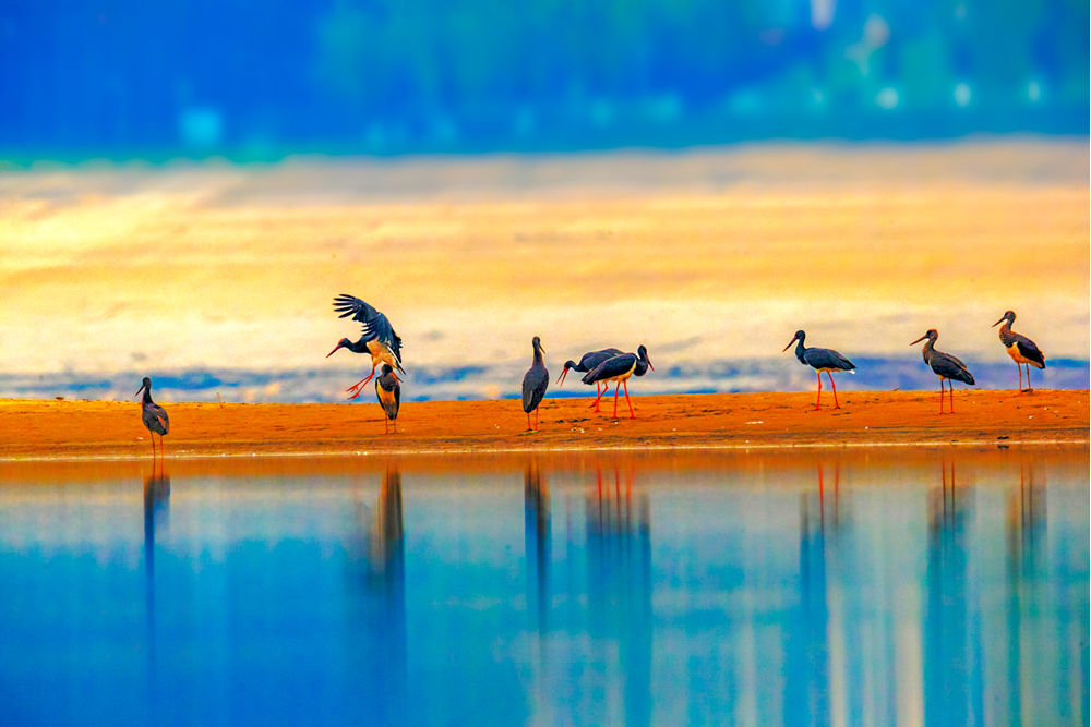 武汉天兴洲越冬的黑鹳。新华网发 魏斌 摄