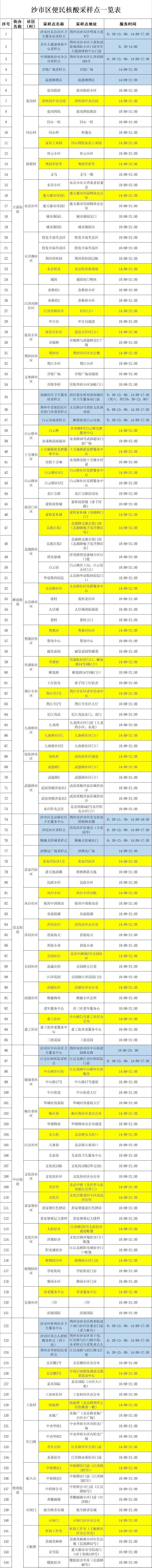 为切实做好新冠肺炎疫情防控工作,保障广大居民朋友身体健康,全区实行核酸检测“两天一检”,对进入开放公共场所及小区的人员严格落实“测温、扫场所码、验健康码、查行程卡、戴口罩、一米线、查验48小时内核酸检测阴性证明”等防疫措施。为方便居民进行核酸检测,从11月5日起,沙市区常态化核酸采样点优化调整为212处(详情见附表)。