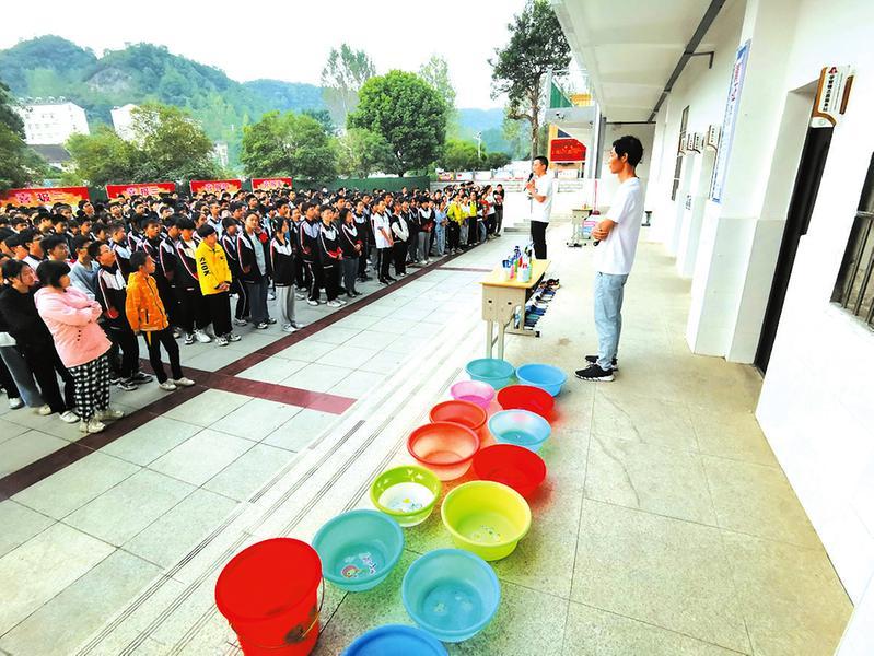 曾都区洛阳镇中心学校以“创文创卫”工作为契机,结合学校实际对学生进行内务培训,培养学生良好的生活、卫生习惯,提高学生生活自理能力。图为政教处老师给学生讲解物品分类摆放、扫除用具摆放、床铺整理的规则。 (随州日报通讯员 赵正勇)