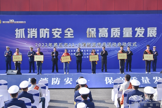 启动仪式上,黄石市消防救援支队支队长程雄鹰部署了消防宣传月相关工作,市委宣传部副部长丁元拾宣读了《关于表彰全市优秀消防志愿服务团队和消防宣传志愿者的通报》,与会领导为获奖团队和个人代表颁发了奖牌及证书。