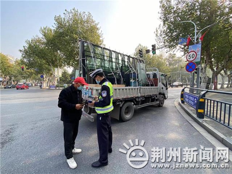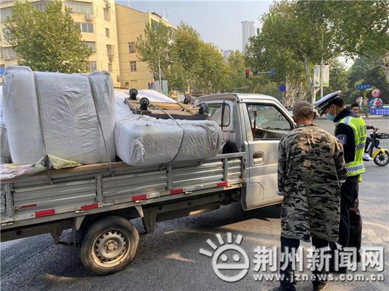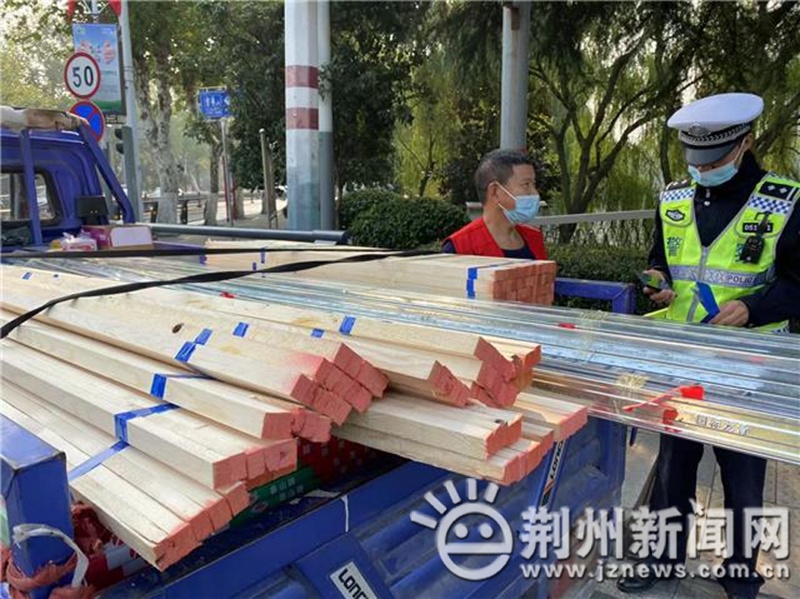 上午9点半,荆州市公安局交管局二大队民警在北京路白云路交会处开展整治行动,一辆三轮车载货超长被民警拦截。
