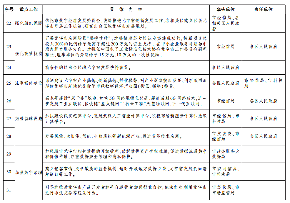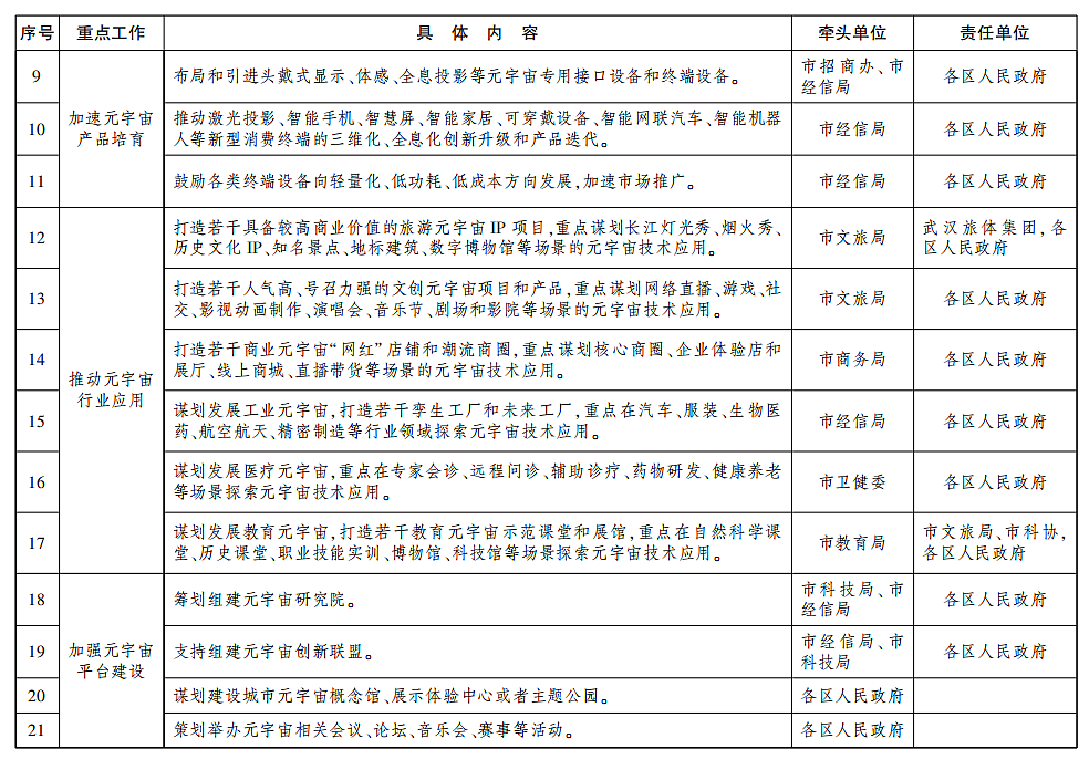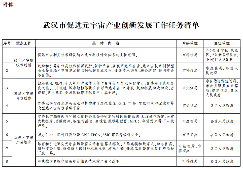 在重点区域谋划建设元宇宙产业基地、创新基地、孵化器等,鼓励园区和所在区针对创新创业团队入驻配套制定场地租金减免,共享研发工具、网络环境、算力资源、数据库资源等降成本政策,引入各类专业机构为入驻企业提供人力资源、知识产权、股权投资、战略咨询等增值服务。《通知》还发布了武汉市促进元宇宙产业创新发展工作任务清单。