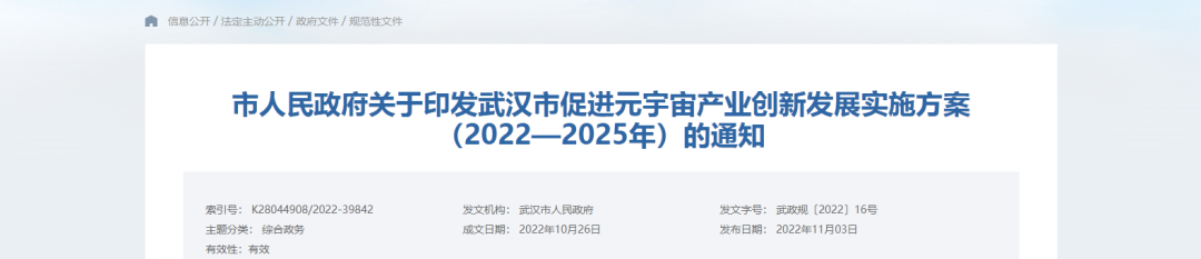 为加快促进我市元宇宙产业创新发展,开辟经济发展新领域新赛道,武汉市人民政府官网发布《市人民政府关于印发武汉市促进元宇宙产业创新发展实施方案(2022—2025年)的通知》。通知明确总体要求,布置重点任务,提出保障措施。