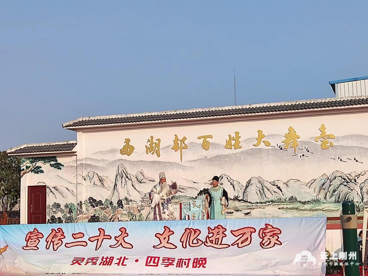 荆州新闻网消息(记者 孙煜瑶 郭佩月)为丰富基层新时代文明实践的内容和形式,提升群众幸福感和文化满意度。近日,由荆州市文化和旅游局主办,荆州市地方戏曲传承院承办的“宣传二十大 文化进万家”活动在沙市区岑河镇西湖村上演。