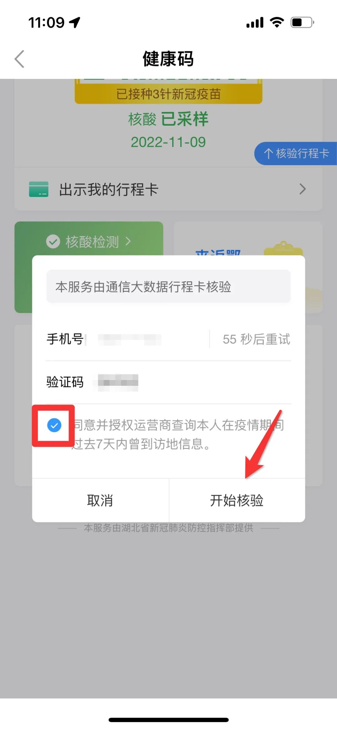 出现以下弹窗,输入手机号获取验证码后,勾选“同意并授权运营商查询本人在疫情期间过去7天内曾到访地信息”,点击“开始核验”,即可给健康码盖上行程戳(行程戳仅在核验当天展示,每日需重新核验才能显示)。