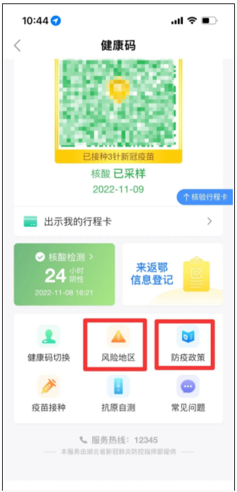 在“湖北健康码”页面下滑,可以看到“风险地区”查询及“防疫政策”查看功能。
