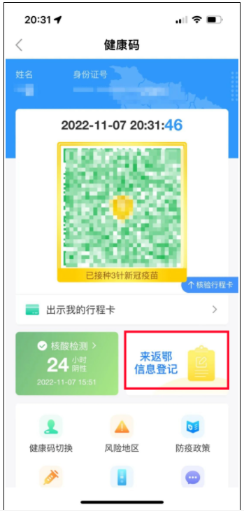 来返鄂的小伙伴需要及时进行信息登记,在“湖北健康码”,点击“来返鄂信息登记”。