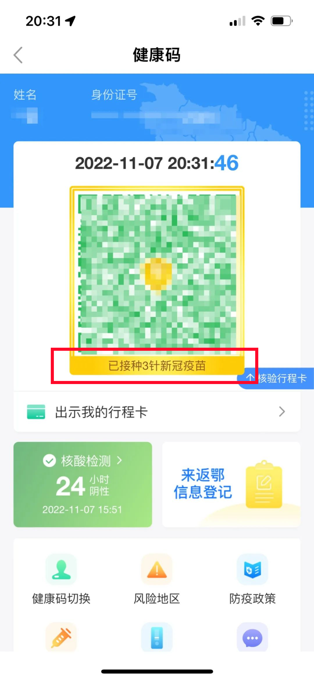 进入“湖北健康码”,完成了新冠疫苗接种的小伙伴们可以看到,健康码外框“已接种新冠疫苗”提示,疫苗接种信息一目了然。