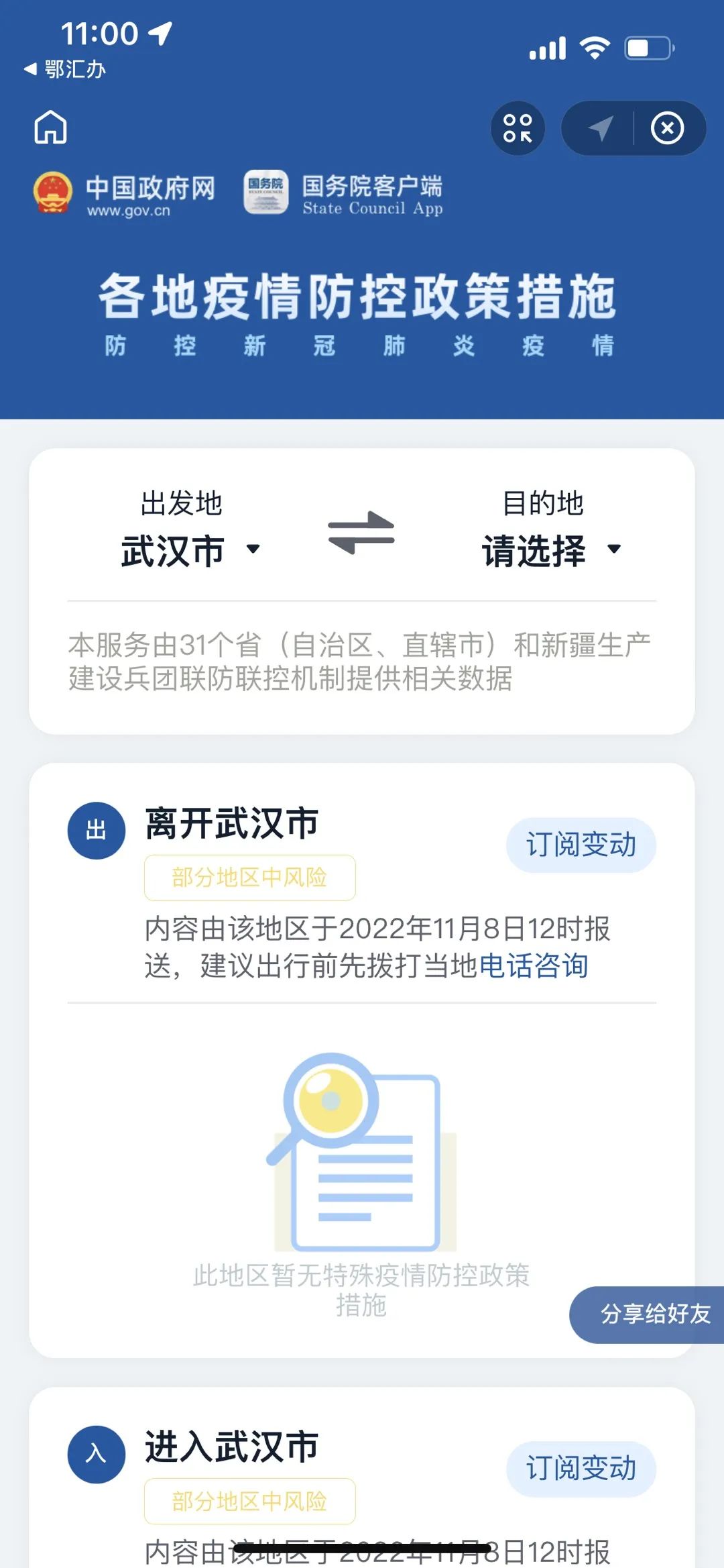 “风险地区”查询、“防疫政策”查看