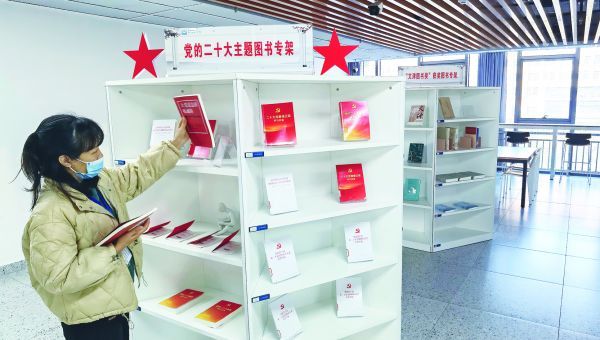 为学习宣传党的二十大精神,市图书馆设立了党的二十大主题图书专架,宣传展示党的二十大文件及学习辅导读物和有关重点图书,满足广大党员干部群众的阅读需求,用浓郁书香凝聚精神力量。(记者 张彩云 摄)