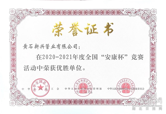 荆楚网(湖北日报网)讯(通讯员 石国良 柯雪梅)近日,中华全国总工会、应急管理部、国家卫生健康委员会联合发文,表彰2020年-2021年度全国“安康杯”竞赛活动先进集体和优秀个人。其中,黄石新兴管业被评为2020-2021年度全国“安康杯”竞赛活动优胜单位。