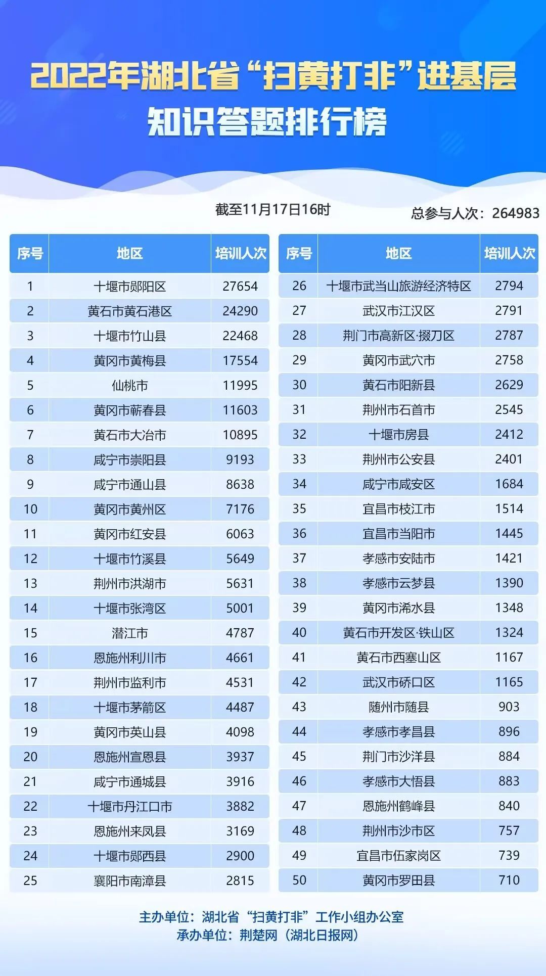 黄石市黄石港区、十堰市竹山县、黄冈市黄梅县、仙桃市、黄冈市蕲春县及黄石市大冶市等县市区的参与人数,均超过了一万人次。