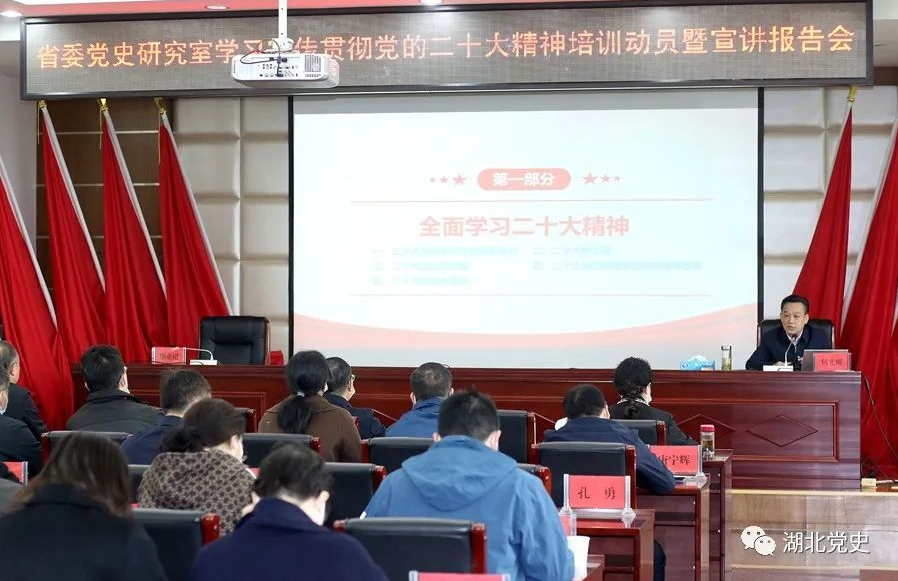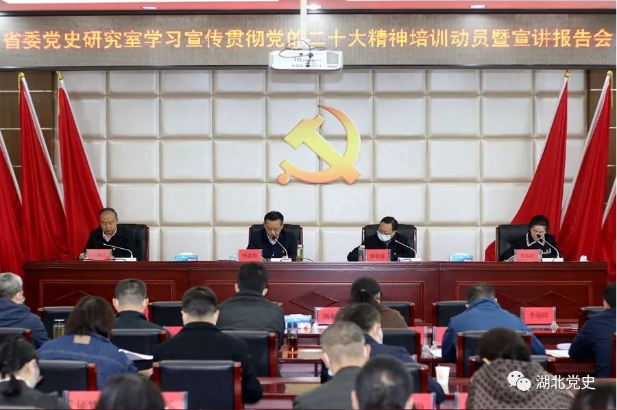 为贯彻中共中央、中共湖北省委关于认真学习宣传贯彻党的二十大精神的决定,落实中央党史和文献研究院关于全国党史和文献部门认真学习宣传贯彻党的二十大精神的通知要求,中共湖北省委党史研究室第一时间研究制定学习宣传贯彻党的二十大精神的实施方案,立足党史工作实际,对组织全覆盖学习培训、全方位宣传宣讲、多层次研究阐释作出具体安排部署,迅速兴起学习宣传贯彻党的二十大精神热潮。