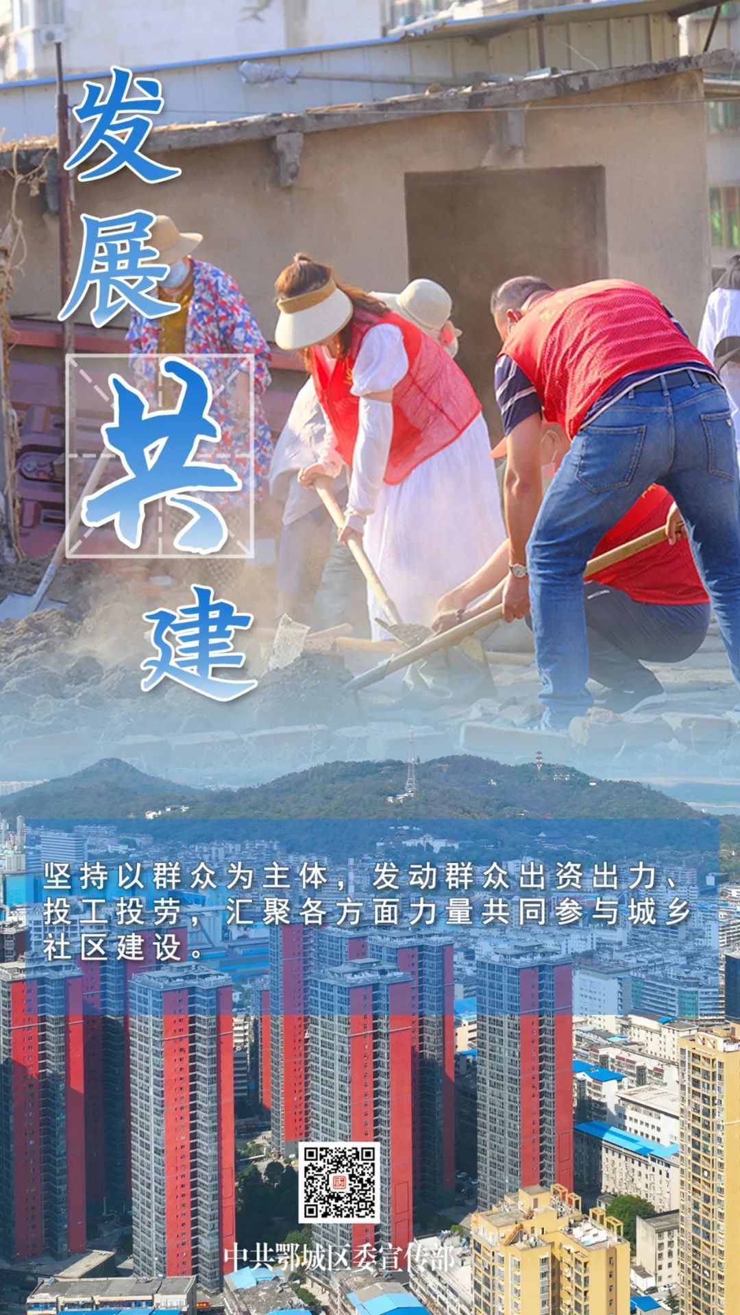 发展共建:坚持以群众为主体,发动群众出资出力、投工投劳,汇聚各方面力量共同参与城乡社区建设。