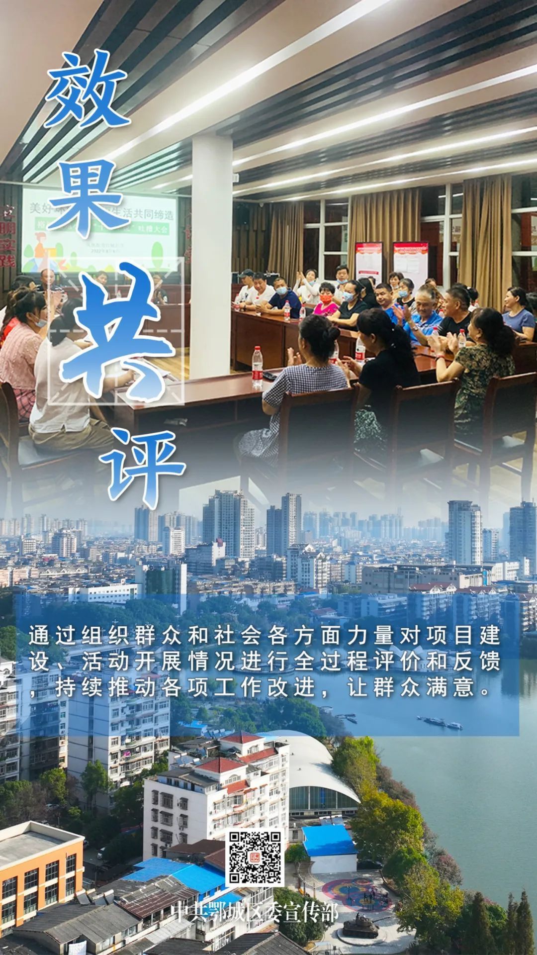 效果共评:通过组织群众和社会各方面力量对项目建设、活动开展情况进行全过程评价和反馈,持续推动各项工作改进,让群众满意。