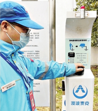 为减少静电危害,该站14名加油工身穿防静电服和防静电鞋上岗。每天上班第一件事,大家会排队触摸静电释放装置。此外,加油橡胶软管内置有导静电铜丝,“每次加油提枪,也会提前彻底释放一次静电”。
