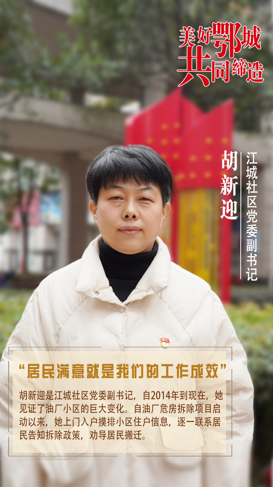 胡新迎是江城社区党委副书记,自2014年到现在,她见证了油厂小区的巨大变化。自油厂危房拆除项目启动以来,她上门入户摸排小区住户信息,逐一联系居民告知拆除政策,劝导居民搬迁。