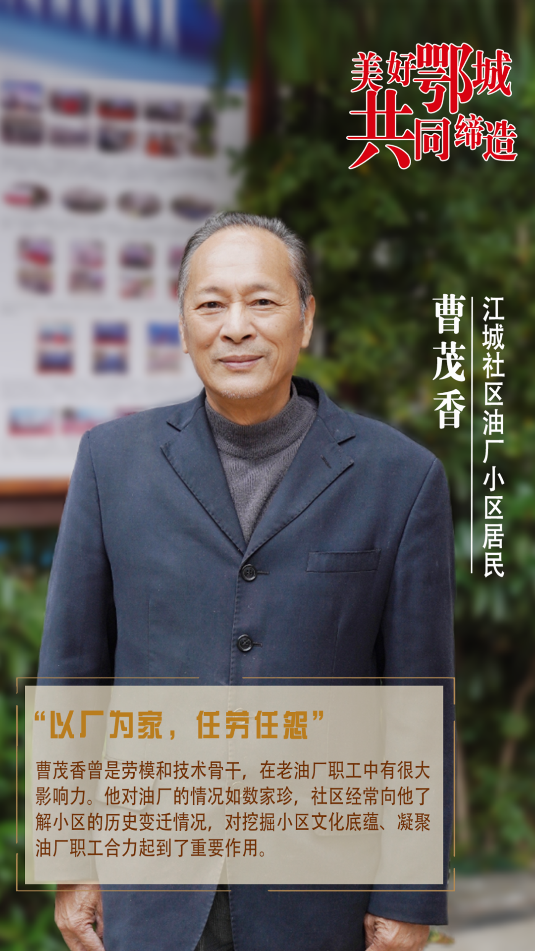 曹茂香曾是劳模和技术骨干,在老油厂职工中有很大影响力。他对油厂的情况如数家珍,社区经常向他了解小区的历史变迁情况,对挖掘小区文化底蕴、凝聚油厂职工合力起到了重要作用。