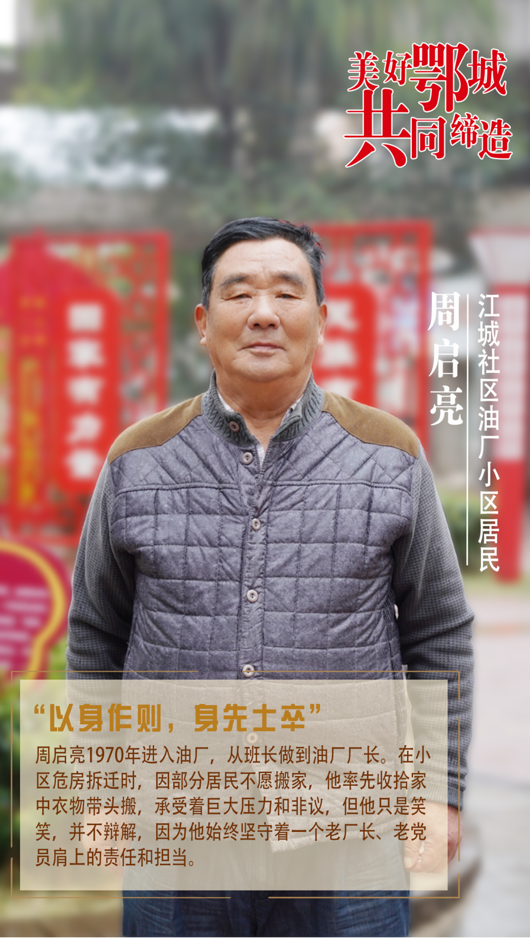 周启亮1970年进入油厂,从班长做到油厂厂长。在小区危房拆迁时,因部分居民不愿搬家,他率先收拾家中衣物带头搬,承受着巨大压力和非议,但他只是笑笑,并不辩解,因为他始终坚守着一个老厂长、老党员肩上的责任和担当。