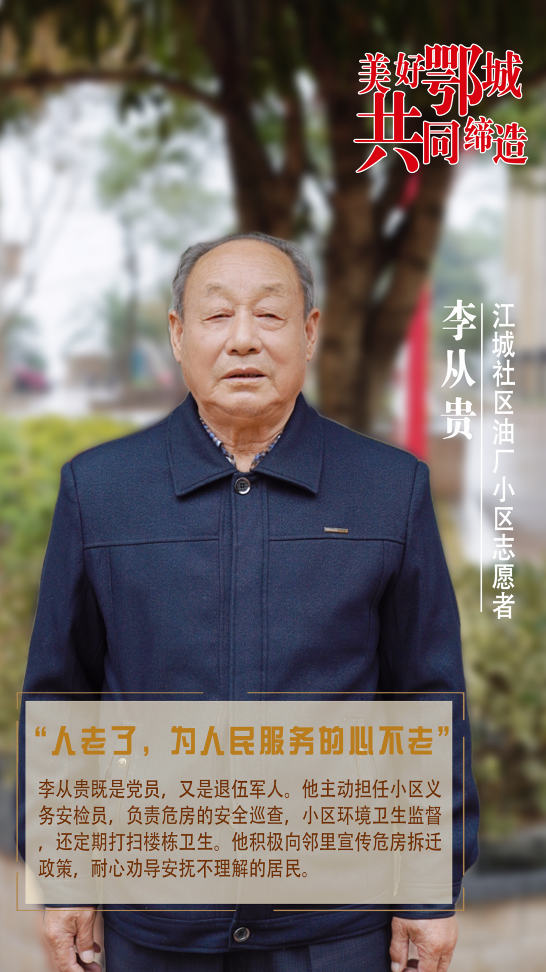 李从贵既是党员,又是退伍军人。他主动担任小区义务安检员,负责危房的安全巡查,小区环境卫生监督,还定期打扫楼栋卫生。他积极向邻里宣传危房拆迁政策,耐心劝导安抚不理解的居民。