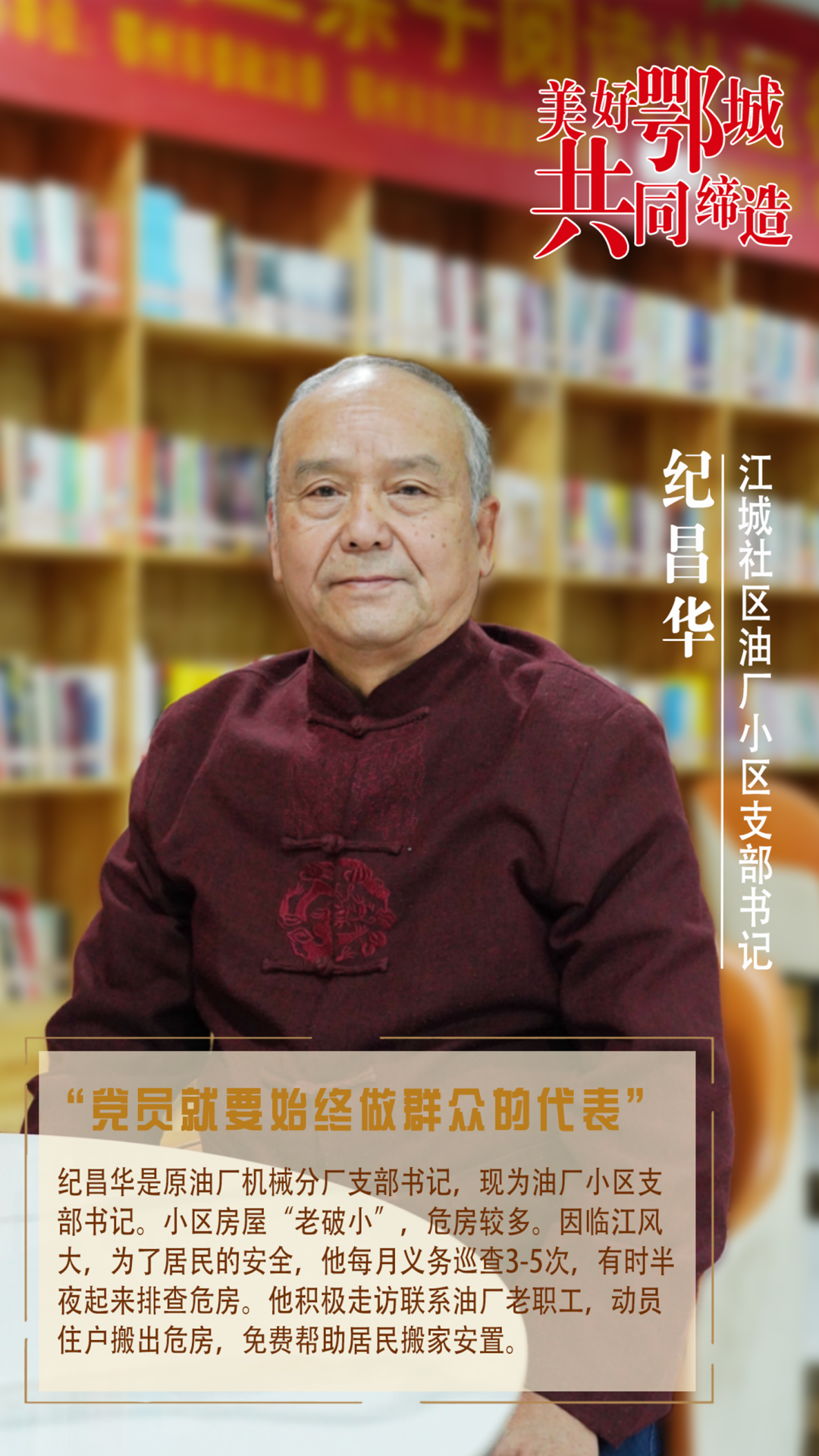 纪昌华是原油厂机械分厂支部书记,现为油厂小区支部书记。小区房屋“老破小”,危房较多。因临江风大,为了居民的安全,他每月义务巡查3-5次,有时半夜起来排查危房。他积极走访联系油厂老职工,动员住户搬出危房,免费帮助居民搬家安置。
