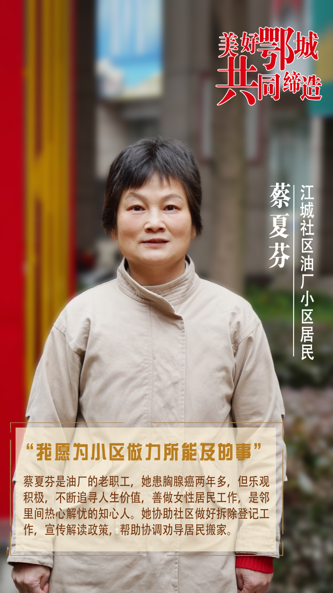 蔡夏芬是油厂的老职工,她患胸腺癌两年多,但乐观积极,不断追寻人生价值,善做女性居民工作,是邻里间热心解忧的知心人。她协助社区做好拆除登记工作,宣传解读政策,帮助协调劝导居民搬家。