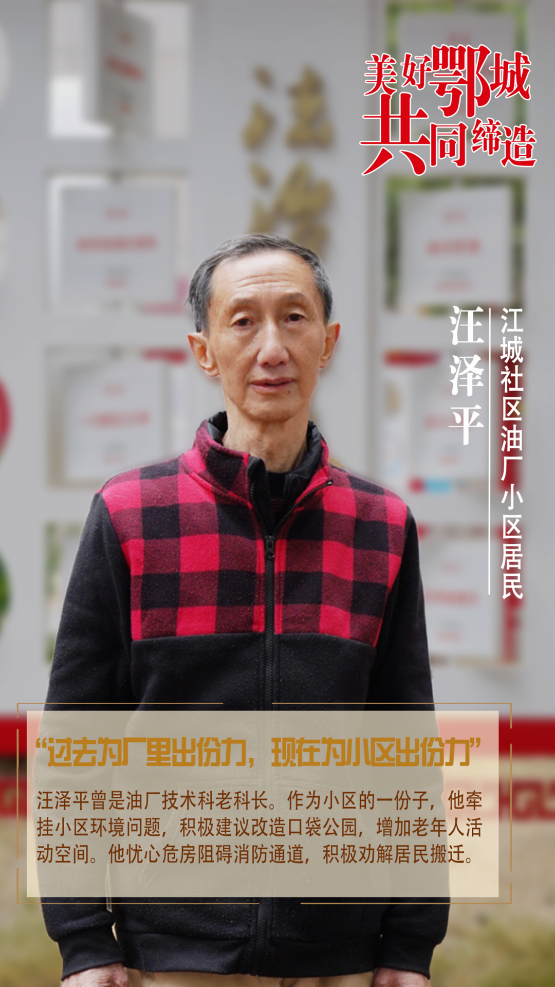 汪泽平曾是油厂技术科老科长。作为小区的一份子,他牵挂小区环境问题,积极建议改造口袋公园,增加老年人活动空间。他忧心危房阻碍消防通道,积极劝解居民搬迁。