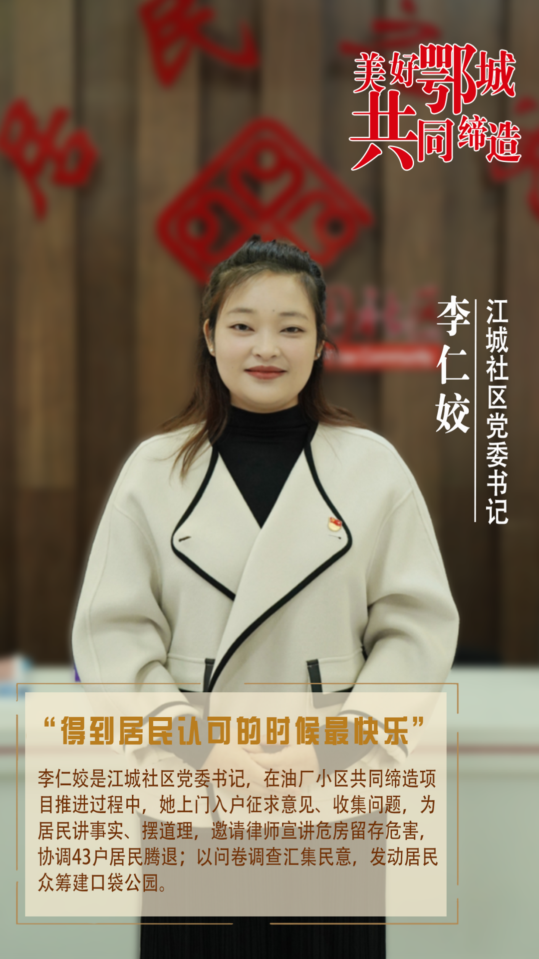 李仁姣是江城社区党委书记,在油厂小区共同缔造项目推进过程中,她上门入户征求意见、收集问题,为居民讲事实、摆道理,邀请律师宣讲危房留存危害,协调43户居民腾退;以问卷调查汇集民意,发动居民众筹建口袋公园。