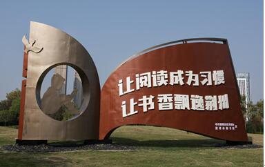 在荆州市图书馆新馆前,景观小品上“让阅读成为习惯,让书香飘逸荆州”的标语醒目大气,聚精会神读书的小孩和白鸽象征着希望,整个景观小品与图书馆的气质相得益彰,让过往市民耳目一新;