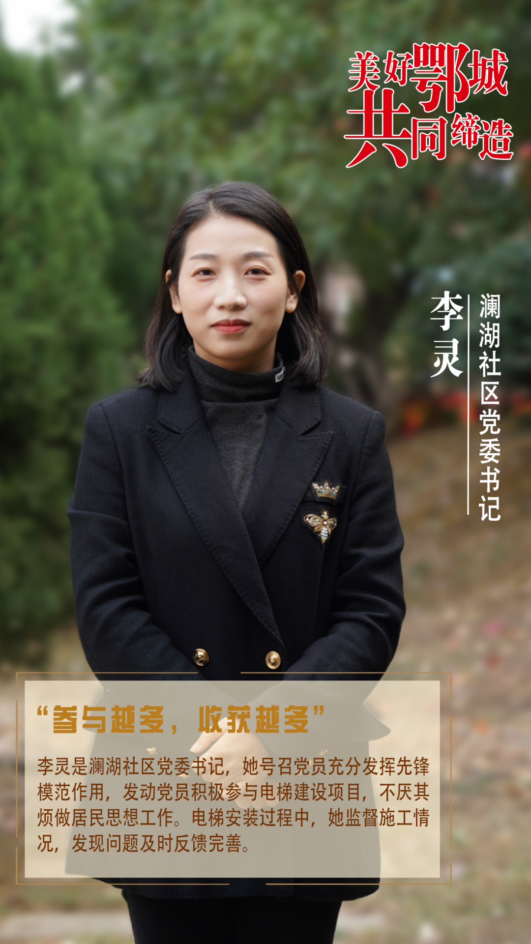 李灵是澜湖社区党委书记,她号召党员充分发挥先锋模范作用,发动党员积极参与电梯建设项目,不厌其烦做居民思想工作。电梯安装过程中,她监督施工情况,发现问题及时反馈完善。