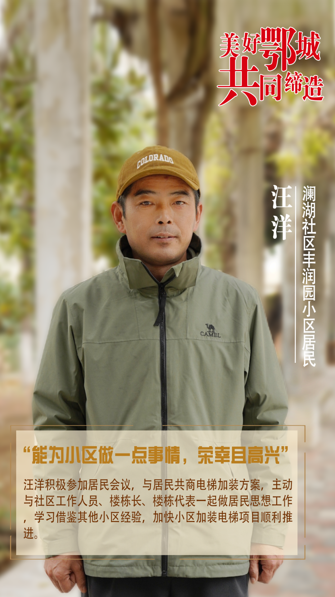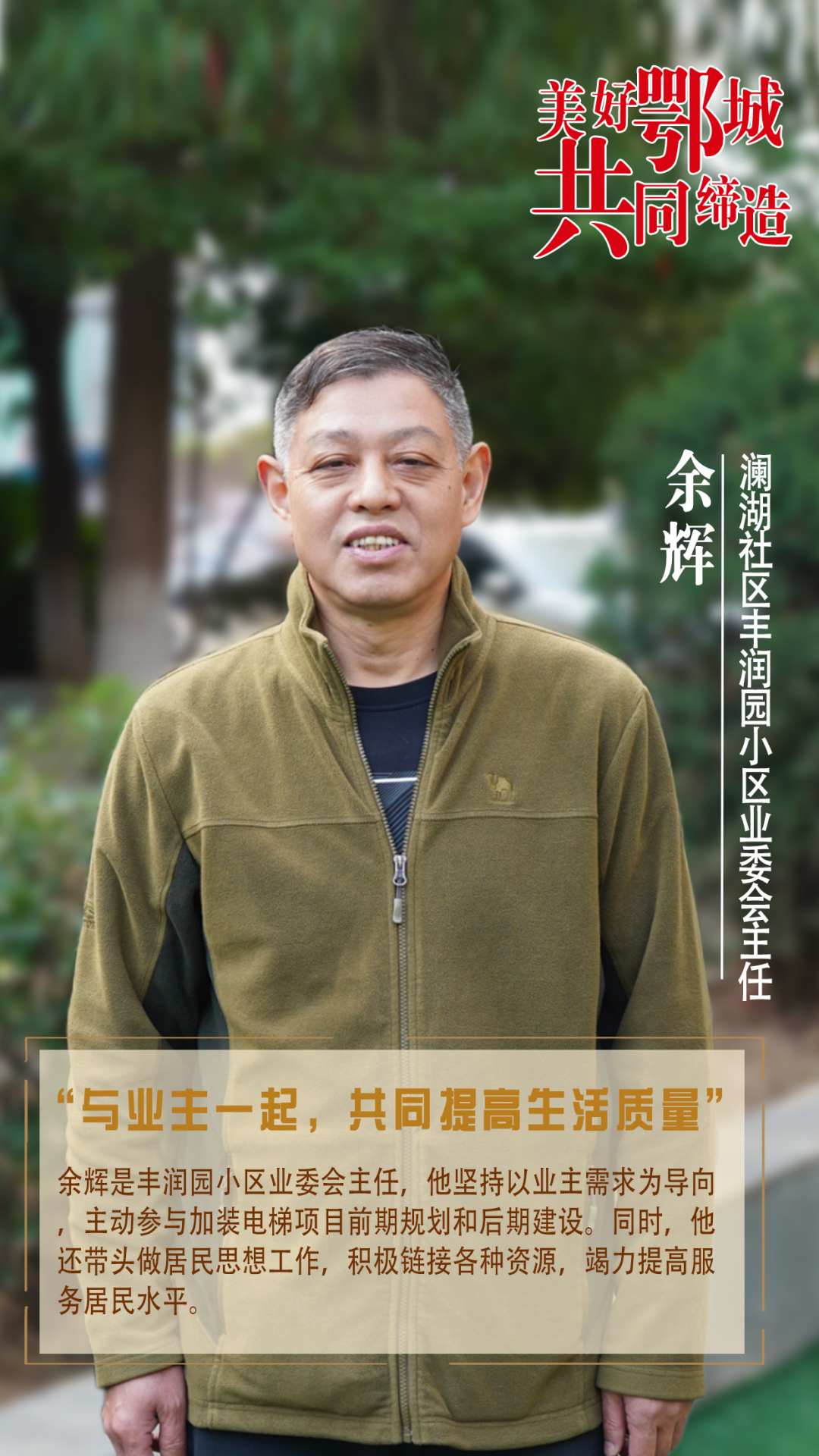 余辉是丰润园小区业委会主任,他坚持以业主需求为导向,主动参与加装电梯项目前期规划和后期建设。同时,他还带头做居民思想工作,积极链接各种资源,竭力提高服务居民水平。