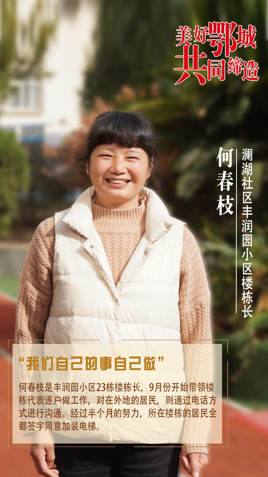 何春枝是丰润园小区23栋楼栋长,9月份开始带领楼栋代表逐户做工作,对在外地的居民,则通过电话方式进行沟通。经过半个月的努力,所在楼栋的居民全都签字同意加装电梯。