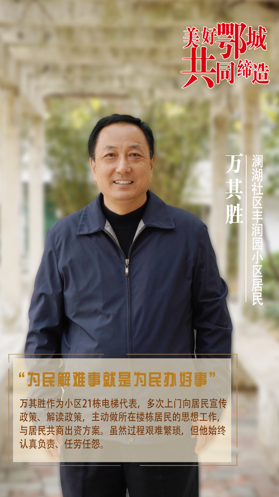 万其胜作为小区21栋电梯代表,多次上门向居民宣传政策、解读政策,主动做所在楼栋居民的思想工作,与居民共商出资方案。虽然过程艰难繁琐,但他始终认真负责、任劳任怨。